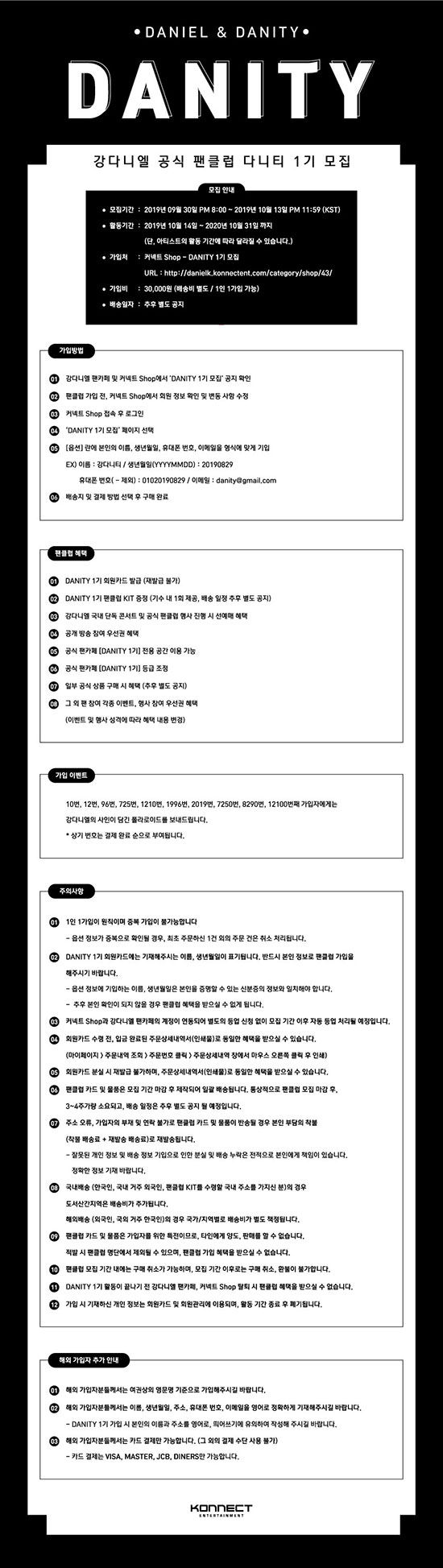 최근 강다니엘 소속사 커넥트엔터테인먼트는 공식 홈페이지에 “공식 팬클럽 DANITY 1기 가입 관련 자주 묻는 질문”이라는 제목의 공지를 게재했다.
