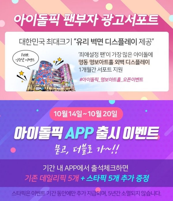 마지막으로 아이돌픽은 리뉴얼 오픈 이벤트로 '팬부자 광고서포트'를 진행, 회원 가입시 설정하는 '최애아이돌'에 가장 많이 설정 된 아이돌의 홍보 영상을 명보아트홀 외벽 전면 디스플레이를 한달동안 채울 예정이다. 발표일은 10월 31일 오후 5시 기준.