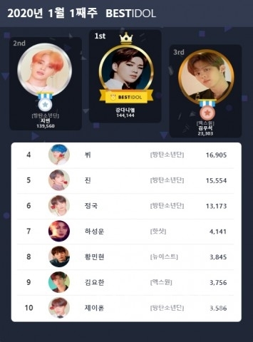 2020년 경자년에 기대되는 쥐띠 아이돌 엑스원의 김우석이 새해를 맞아 상승세를 타며 3위를 차지해 기분 좋은 출발을 했으며 4위는 방탄소년단의 뷔가 차지했다. 5위는 방탄소년단의 진이 차지했으며, 6위는 방탄소년단의 정국, 7위는 하성운이 차지했다.