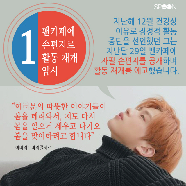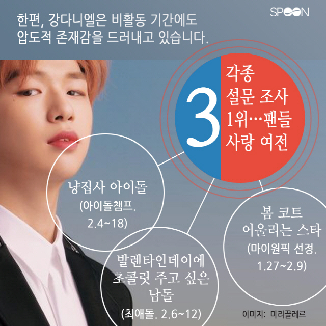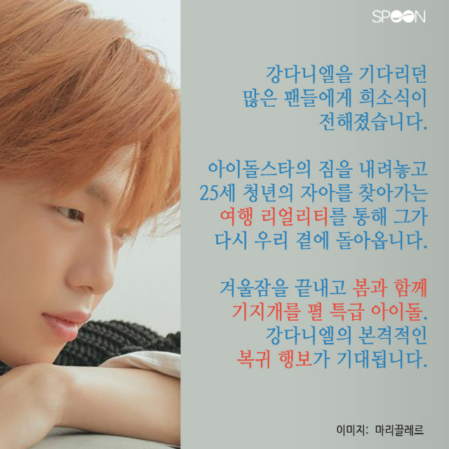 강다니엘이 돌아옵니다. 자신의 이름을 내건 예능 리얼리티 '안녕, 다니엘'을 통해 본격적인 복귀 수순을 밟을 예정인데요. 현재 그는 건강이 많이 좋아진 상태이고 촬영에도 열심히 임하고 있다고 합니다. 또한 이후 앨범 준비도 순차적으로 진행할 예정이라고 합니다. 휴식기에도 각종 지표에서 막강한 존재감을 유지하고 있는 강다니엘. 아이돌차트 평점 랭킹에선 무려 100주 연속 1위를 차지했고 카카오프렌즈와 협업한 제품도 국내외에서 큰 인기를 얻고 있습니다. 팬들을 향한 손편지에서 '얼어붙어있던 겨울에도 끝이 있다'라고 한 것처럼 겨울잠을 끝내고 봄과 함께 기지개를 펼 그의 복귀 행보에 팬들의 기대감이 커지고 있습니다.