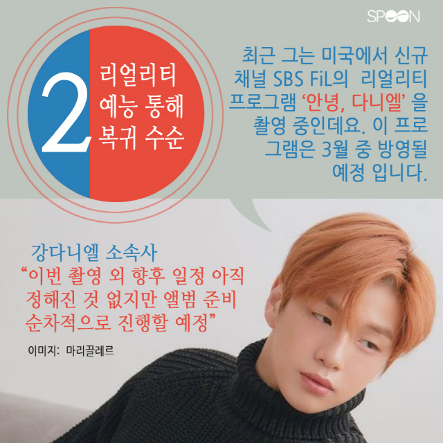 강다니엘이 돌아옵니다. 자신의 이름을 내건 예능 리얼리티 '안녕, 다니엘'을 통해 본격적인 복귀 수순을 밟을 예정인데요. 현재 그는 건강이 많이 좋아진 상태이고 촬영에도 열심히 임하고 있��
