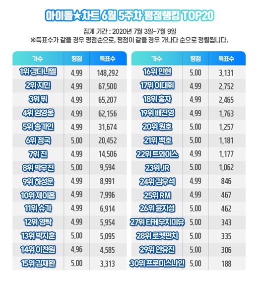 [마이데일리 = 여동은 기자] 가수 강다니엘이 6월 5주차 아이돌차트 평점랭킹에서 최다득표를 기록했다.