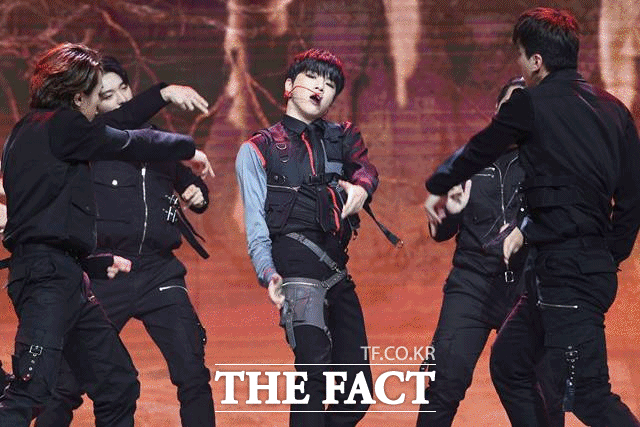 무대 위 강다니엘은 블랙 바탕의 의상으로 야성미를 자아냈습니다. 여기에 레드로 의상 중간에 포인트를 줬고 한쪽 소매는 그레이로 변화를 줘 단조로움을 피했습니다.