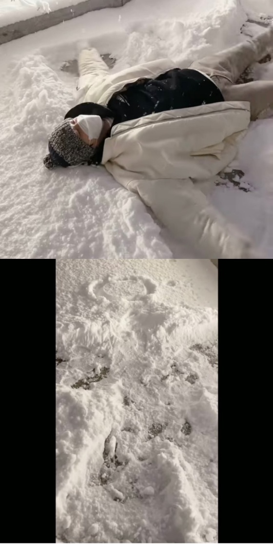 가수 강다니엘이 눈밭 천사 만들기에 도전했다.