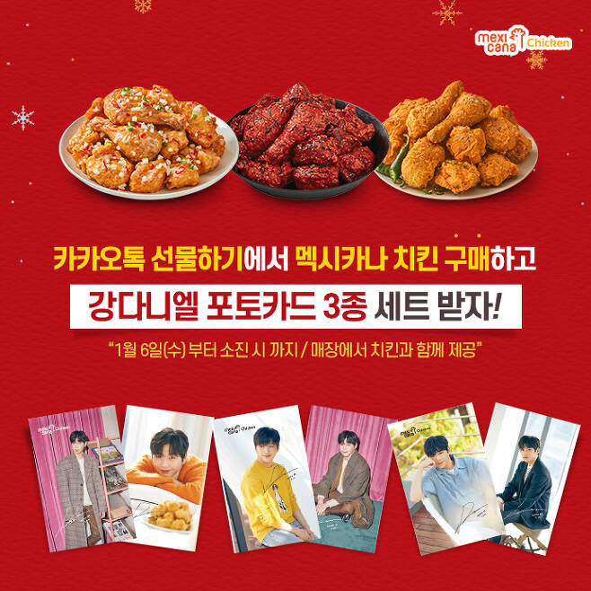 치킨 프랜차이즈 기업 멕시카나(대표이사 최광은)가 새해를 맞아 '강다니엘 NEW 포토카드' 증정 이벤트를 진행한다. 멕시카나는 카카오톡 선물하기 내 멕시카나 채널에서 판매 중인 치킨을 구매