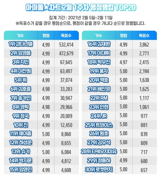 가수 강다니엘이 2월 1주차 아이돌차트 평점랭킹에서 최다득표를 기록했다. 아이돌차트에 따르면 지난 2월 5일부터 11일까지 집계된 평점랭킹에서 강다니엘은 53만 2414표를 얻어 151주 연속 최다