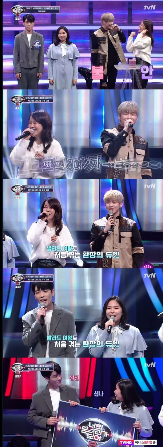 [OSEN=최정은 기자] 백지영과 강다니엘이 실력자 찾기에 실패하며, '민족사관 고등학교 음치 듀오'와 듀엣무대로 '그 여자'를 함께 불렀다.