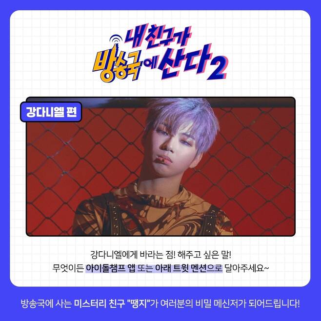 [뉴스엔 박수인 기자] 가수 강다니엘이 '내 친구가 방송국에 산다' 시즌2에 출연한다. '아이돌챔프' 공식 SNS에 따르면 강다니엘은 MBC플러스 디지털 콘텐츠 '내 친구가 방송국에 산다 시즌2'에 출