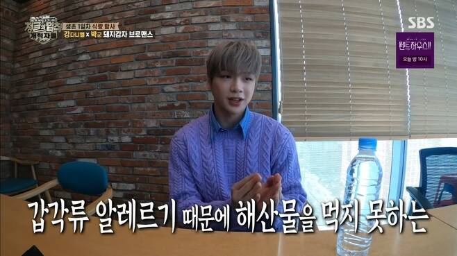 이날 돼지감자 캐는 강다니엘을 보며 박군은 "선배님 해산물 못 드신다고 하시지 않았습니까?"라고 물었다. 사전 인터뷰에서 강다니엘은 "해산물 알레르기가 있어서 딱딱한 애들. 조개, 새우, 바닷가재, 굴, 키조개처럼 겉면이 딱딱한 애들은 거의 다 못 먹는다. 피부에 닿기만 해도 두드러기가 올라온다"고 갑각류 알레르기가 있다고 밝혔다.