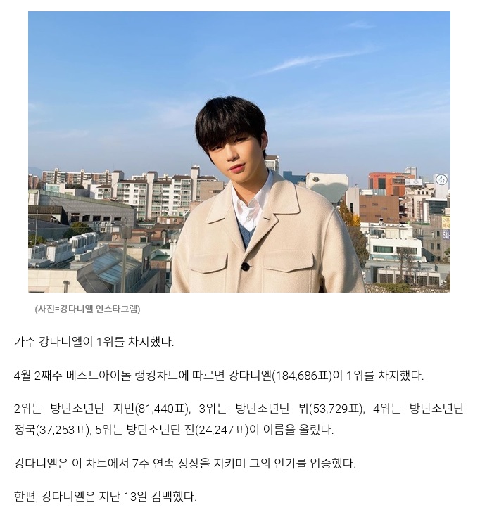 가수 강다니엘이 1위를 차지했다.4월 2째주 베스트아이돌 랭킹차트에 따르면 강다니엘(184,686표)이 1위를 차지했다.2위는 방탄소년단 지민(81,440표), 3위는 방탄소년단 뷔(53,729표), 4위는 방탄소년