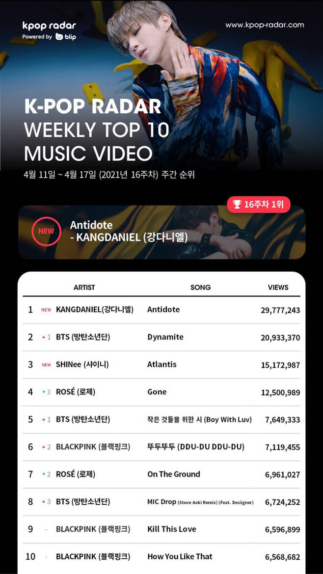 강다니엘의 신곡 ‘Antidote(안티도트)’ 뮤직비디오는 케이팝 레이더 16주차 집계 기간 (4월 11일 ~ 4월 17일) 동안 2977만 뷰를 기록하며, 컴백과 동시에 1위의 자리에 올랐다.
