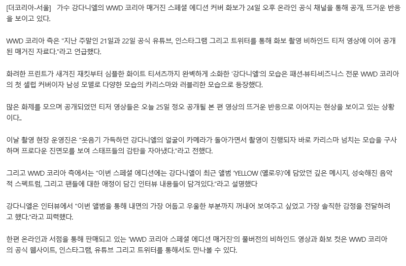 [더코리아-서울] 가수강다니엘의WWD코리아매거진스페셜에디션커버화보가24일오후온라인공식채널을통해공개,뜨거운반응을보이고있다.WWD코리아측은"지난주말인21일과22일공식유튜브,인스타그