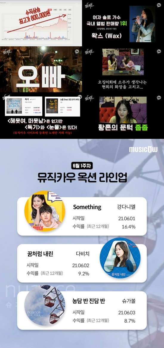 한편 뮤직카우에서는 현재 브레이브걸스 ‘롤린’을 비롯해 임창정의 ‘소주한잔, 빅마마 ‘체념’, 자이언티 ‘양화대교’ 등 인기 스테디셀러는 물론 90년대부터 최신 아이돌까지 다양한 장르의 약 850여곡을 거래 중이며 매주 5~7곡을 추가로 공개하고 있다.