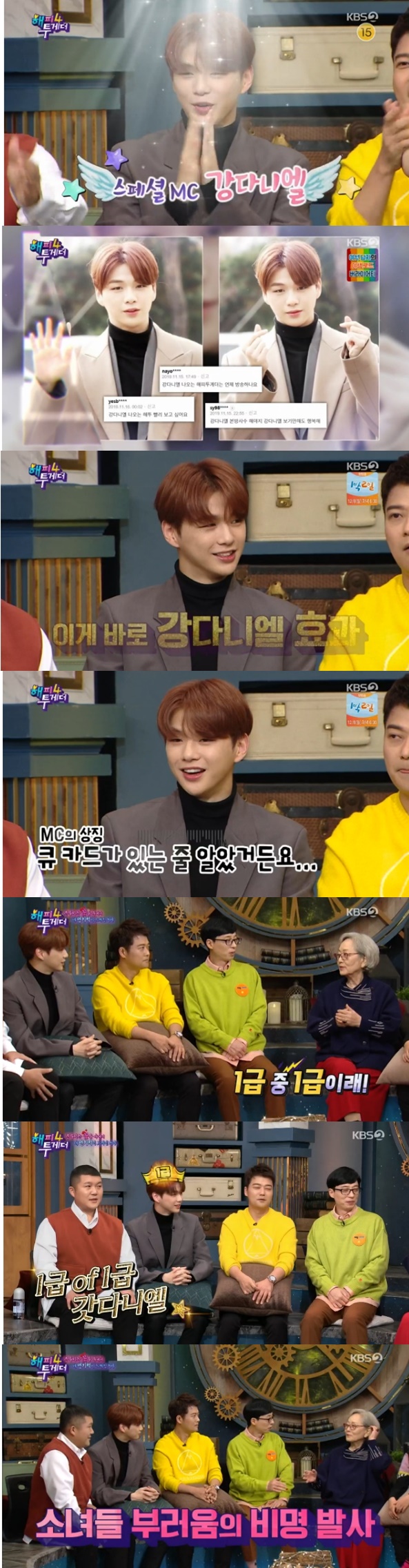 특히 김영옥은 강다니엘을 향해 "1급 중의 1급"이라며 “내가 강다니엘과 함께 출연한다고 하니까 주변에서 그렇게 부러워한다”며 만남을 기뻐했다.(사진=KBS 2TV '해투4' 캡처)